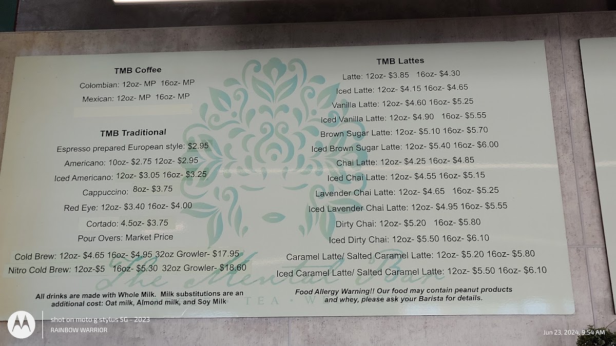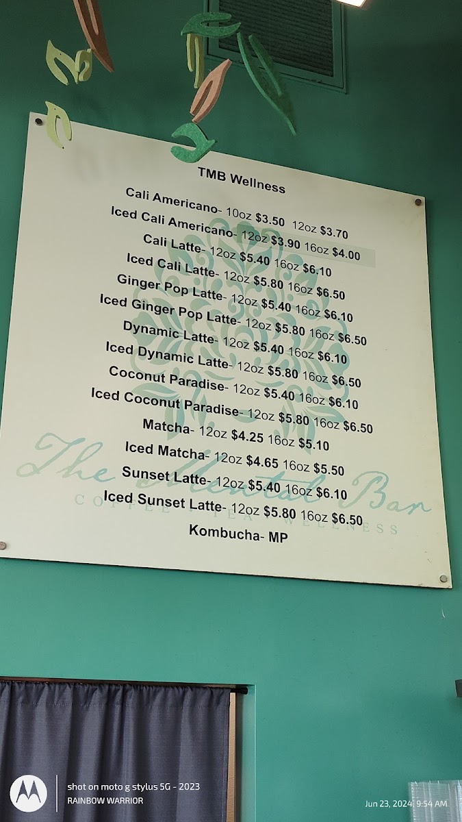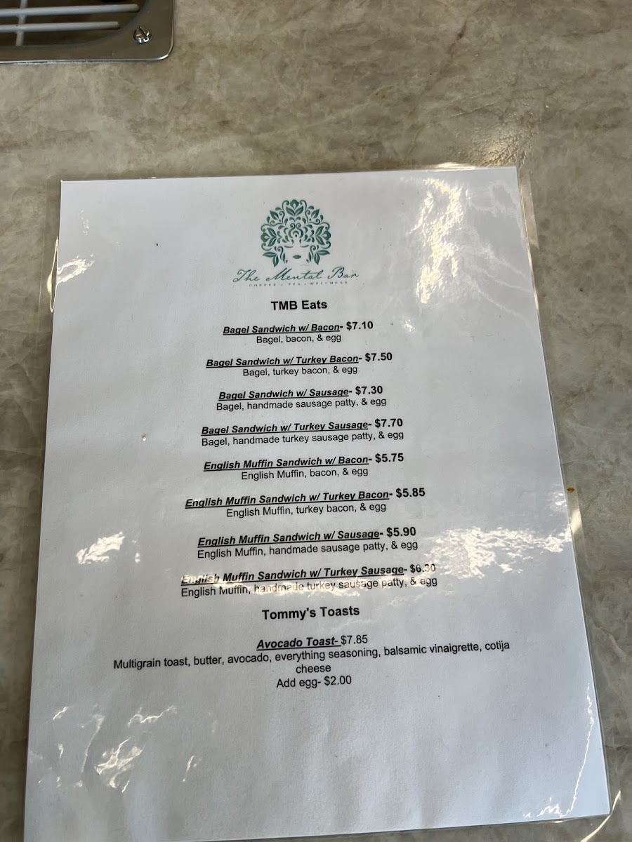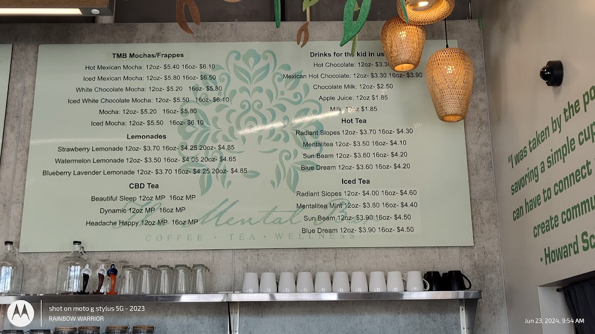 The menu at The Mental Bar - Coffee, Tea & Wellness offers a delightful mix of beverages and food options, perfect for any time of the day. For those seeking energizing drinks, the Iced Cali Americano and Cali Latte are refreshing choices, while wellness-focused options like the Dynamic Latte and Coconut Paradise provide unique flavors. Coffee enthusiasts can enjoy the Coffee of the Day or dive into traditional favorites like Iced Americano and Cappuccino. Lattes come in various flavors, with the Brown Sugar Latte and Caramel Latte standing out, alongside specialty drinks such as the Dirty Chai Latte. The indulgent Dark Chocolate Mocha and Mexican Mocha are perfect for those craving something richer, while frappes like the Dirty Chai Frappe and Green Tea Matcha Frappe are deliciously cool options. Refreshing Blueberry Lavender Lemonade and Strawberry Lemonade offer a fruity twist, and the tea selection includes blends like Blue Dream and Mentalitea. For younger patrons or the young at heart, drinks like Chocolate Milk and Mexican Hot Chocolate are sure to please. Seasonal specials like the Minty Vitality Tea and Golden Glow Brew add a touch of excitement. The Tommy’s Toasts provide a savory snack, with options like Avocado Toast and Bagel with Cream Cheese. Breakfast dishes such as the Bagel Sandwich and Breakfast Burrito offer a hearty start, while wraps like the Turkey Melt and Turkey Wrap make for satisfying meals. For a lighter option, try the Lox Salad or a Turkey Salad. Sweet treats like Apple Danish and Coffee Cake complement the coffee offerings. The secret menu is also a fun addition, with drinks like Blue Dream Fog and the Jose Special providing hidden gems for adventurous customers. With its broad selection, The Mental Bar caters to a variety of tastes and preferences, ensuring a pleasant experience for every visitor.