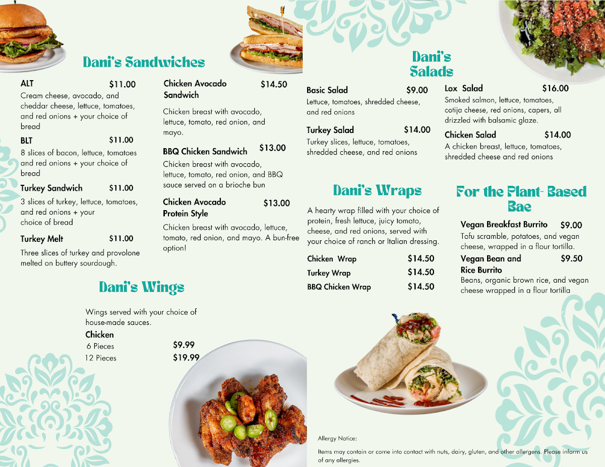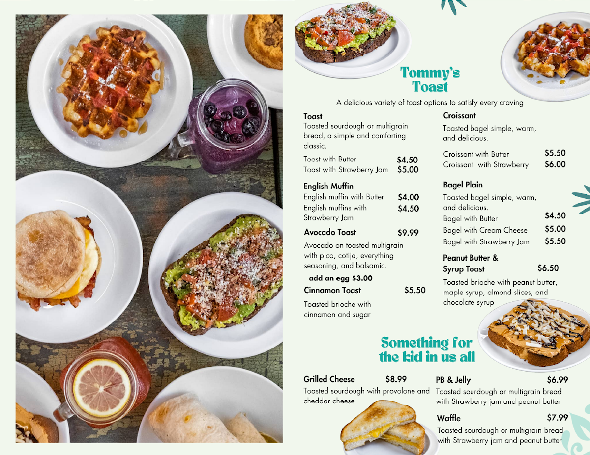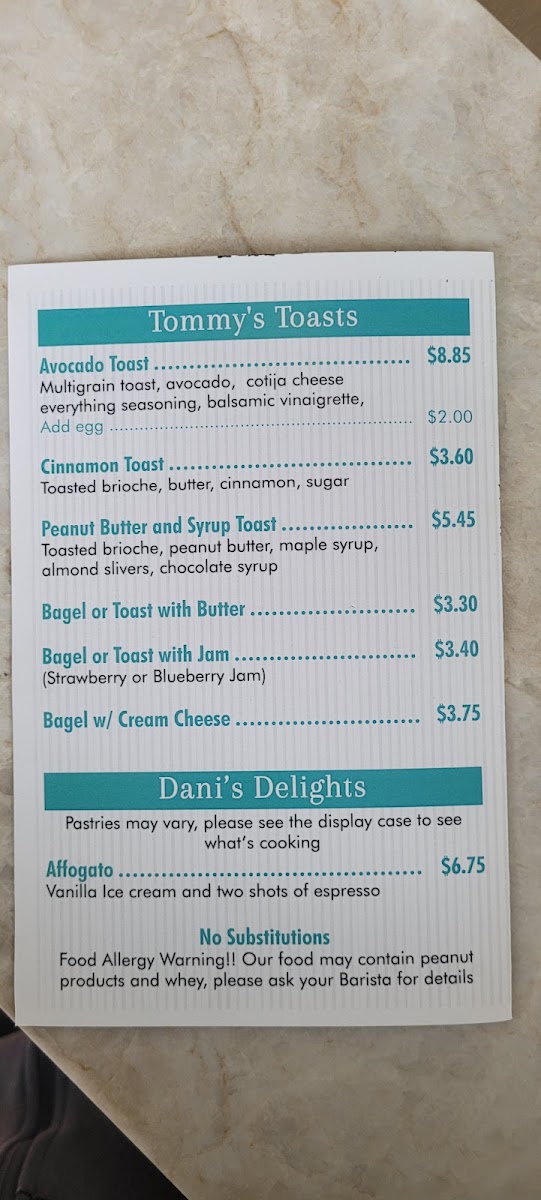 The menu at The Mental Bar - Coffee, Tea & Wellness offers a delightful mix of beverages and food options, perfect for any time of the day. For those seeking energizing drinks, the Iced Cali Americano and Cali Latte are refreshing choices, while wellness-focused options like the Dynamic Latte and Coconut Paradise provide unique flavors. Coffee enthusiasts can enjoy the Coffee of the Day or dive into traditional favorites like Iced Americano and Cappuccino. Lattes come in various flavors, with the Brown Sugar Latte and Caramel Latte standing out, alongside specialty drinks such as the Dirty Chai Latte. The indulgent Dark Chocolate Mocha and Mexican Mocha are perfect for those craving something richer, while frappes like the Dirty Chai Frappe and Green Tea Matcha Frappe are deliciously cool options. Refreshing Blueberry Lavender Lemonade and Strawberry Lemonade offer a fruity twist, and the tea selection includes blends like Blue Dream and Mentalitea. For younger patrons or the young at heart, drinks like Chocolate Milk and Mexican Hot Chocolate are sure to please. Seasonal specials like the Minty Vitality Tea and Golden Glow Brew add a touch of excitement. The Tommy’s Toasts provide a savory snack, with options like Avocado Toast and Bagel with Cream Cheese. Breakfast dishes such as the Bagel Sandwich and Breakfast Burrito offer a hearty start, while wraps like the Turkey Melt and Turkey Wrap make for satisfying meals. For a lighter option, try the Lox Salad or a Turkey Salad. Sweet treats like Apple Danish and Coffee Cake complement the coffee offerings. The secret menu is also a fun addition, with drinks like Blue Dream Fog and the Jose Special providing hidden gems for adventurous customers. With its broad selection, The Mental Bar caters to a variety of tastes and preferences, ensuring a pleasant experience for every visitor.