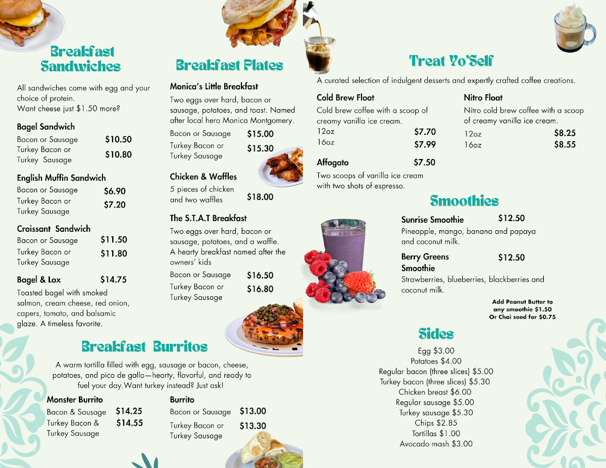 Two eggs over hard, your choice of three bacon slices or a sausage patty with one cup of potatoes and your choice of toast. This breakfast is named after a local hero Monica Montgomery-Steppe.